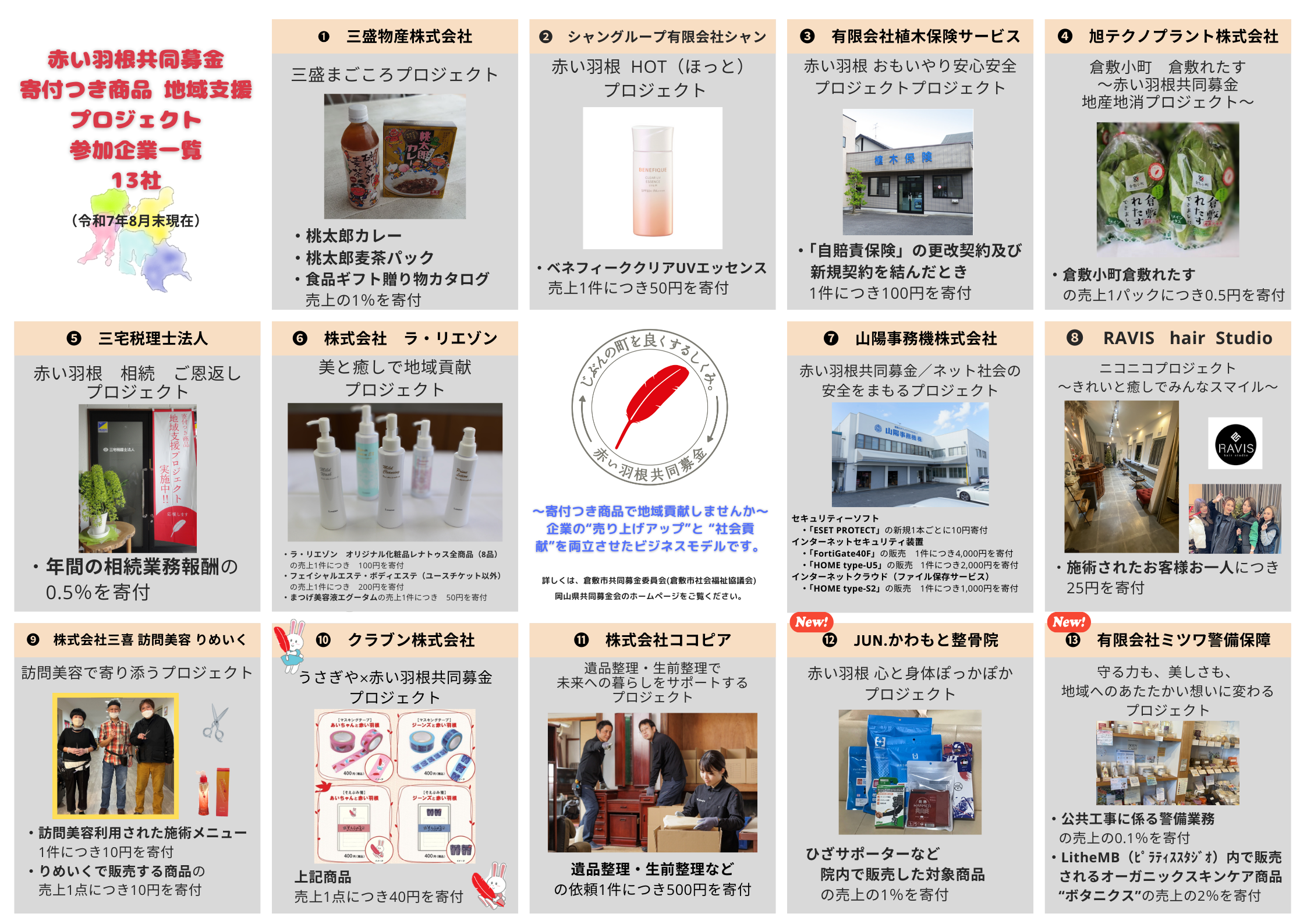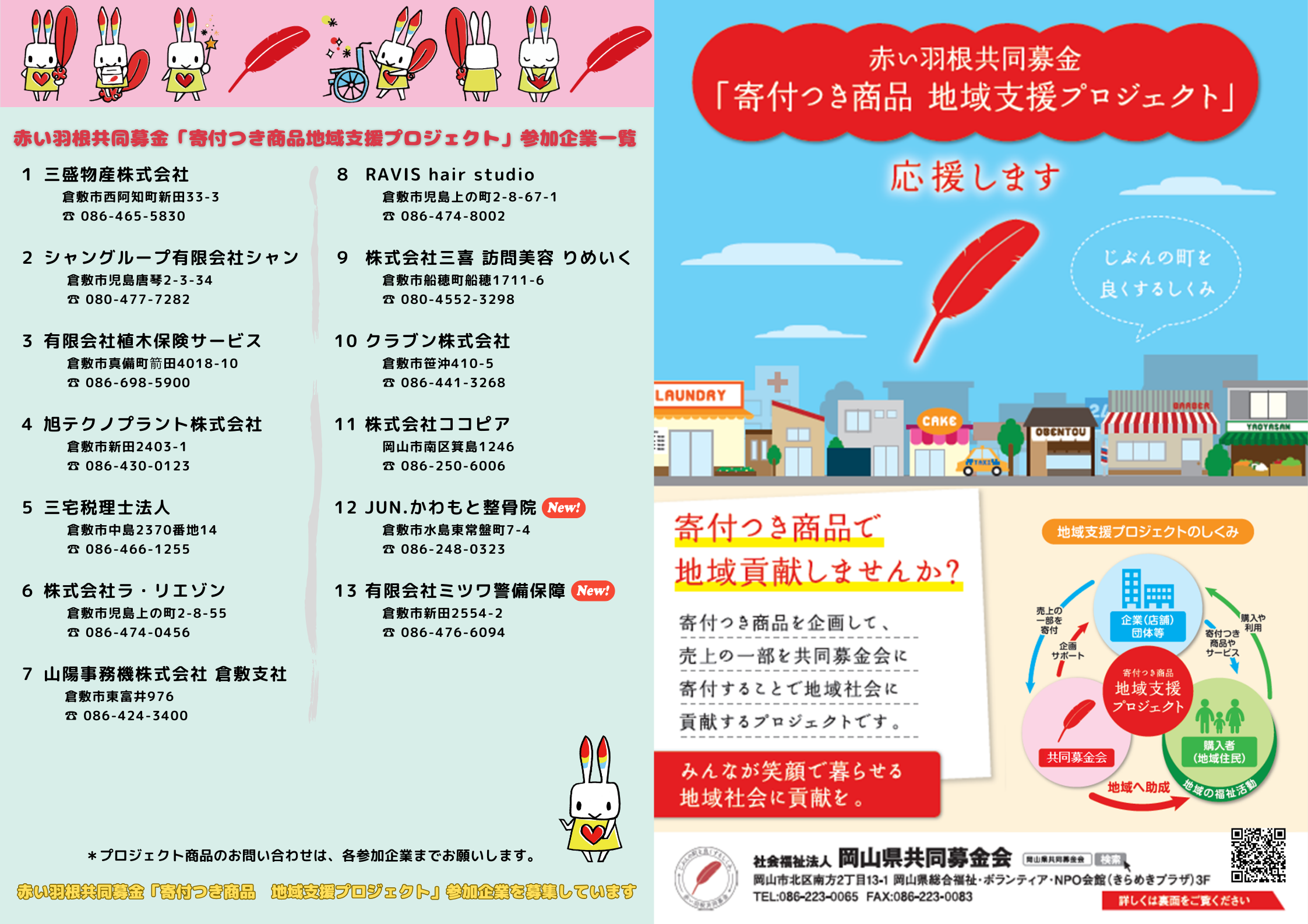 岡山県共同募金会では、共同募金運動への新しい参加のかたちとして、赤い羽根共同募金「寄付つき商品 地域支援プロジェクト」を平成28年度からスタートさせ、その参加企業を募集しています。