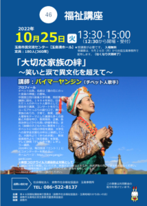 チベット人歌手のバイマ―ヤンジン先生を講師としてお招きし、ご講演いただきます。ヤンジン先生が乗り越えられてきた様々な困難のこと、家族のあり方、日本とチベットの文化の違いなどをお話ししていただきます。