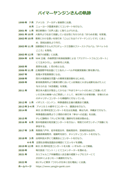 チベット人歌手のバイマ―ヤンジン先生を講師としてお招きし、ご講演いただきます。ヤンジン先生が乗り越えられてきた様々な困難のこと、家族のあり方、日本とチベットの文化の違いなどをお話ししていただきます。