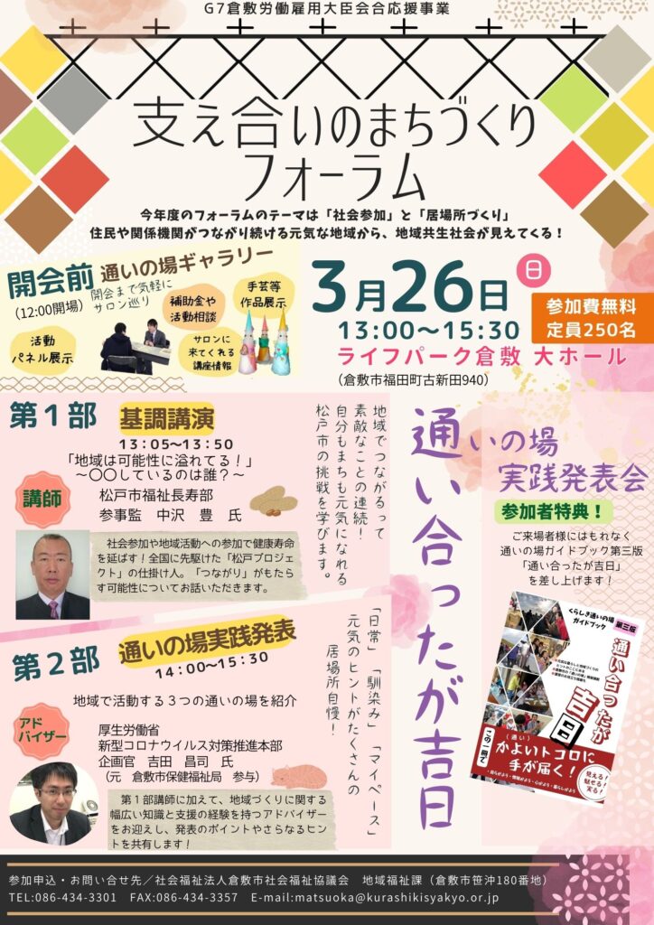 ・新型コロナウイルス感染症感染拡大による急な予定変更については、ご了承ください。その際は倉敷市社会福祉協議会ホームページ等でのご確認をお願いします。