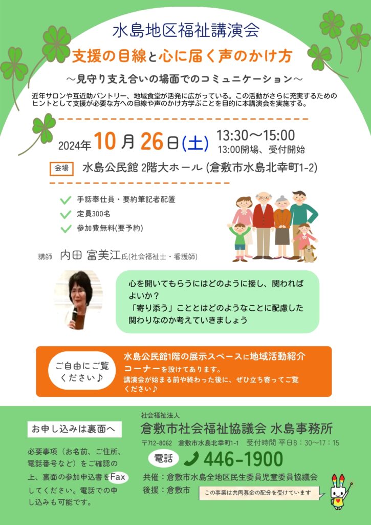 令和6年度 水島地区福祉講演会「支援の目線と心に届く声のかけ方 ~見守り支え合いの場面でのコミュニケーション~」を開催します!