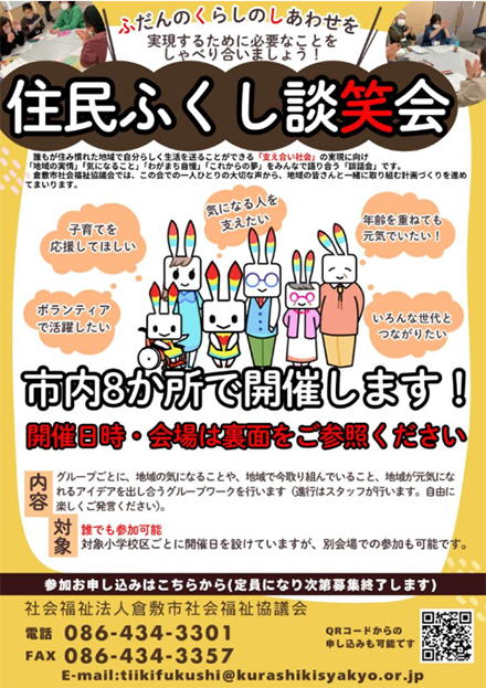 今後、第4次地域福祉活動計画策定に向けて、計画づくりの根幹となる住民の声や地域の実情をお聞きする場として、「住民ふくし談笑会」と称した座談会を別紙チラシのとおり市内8地区で開催いたします。