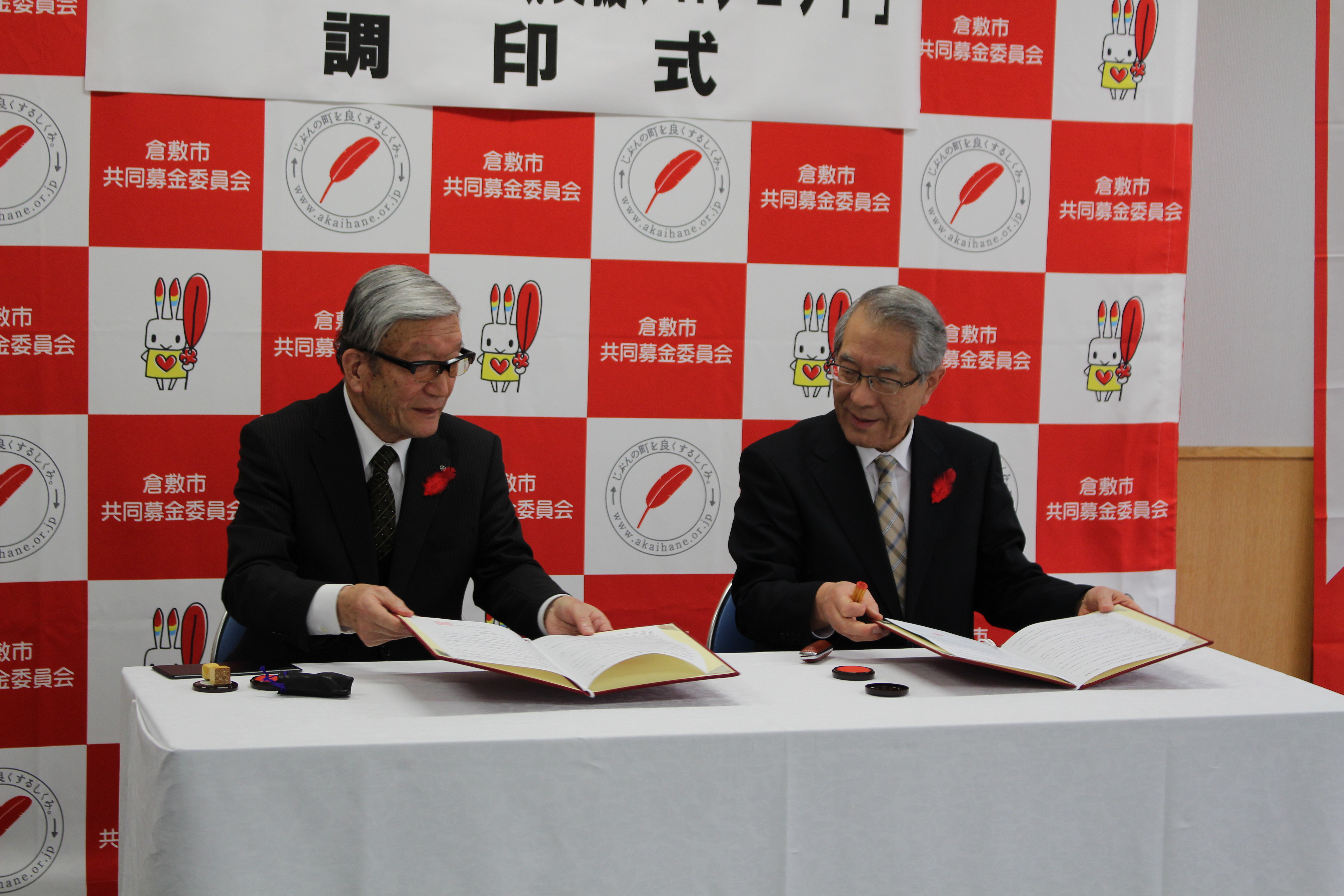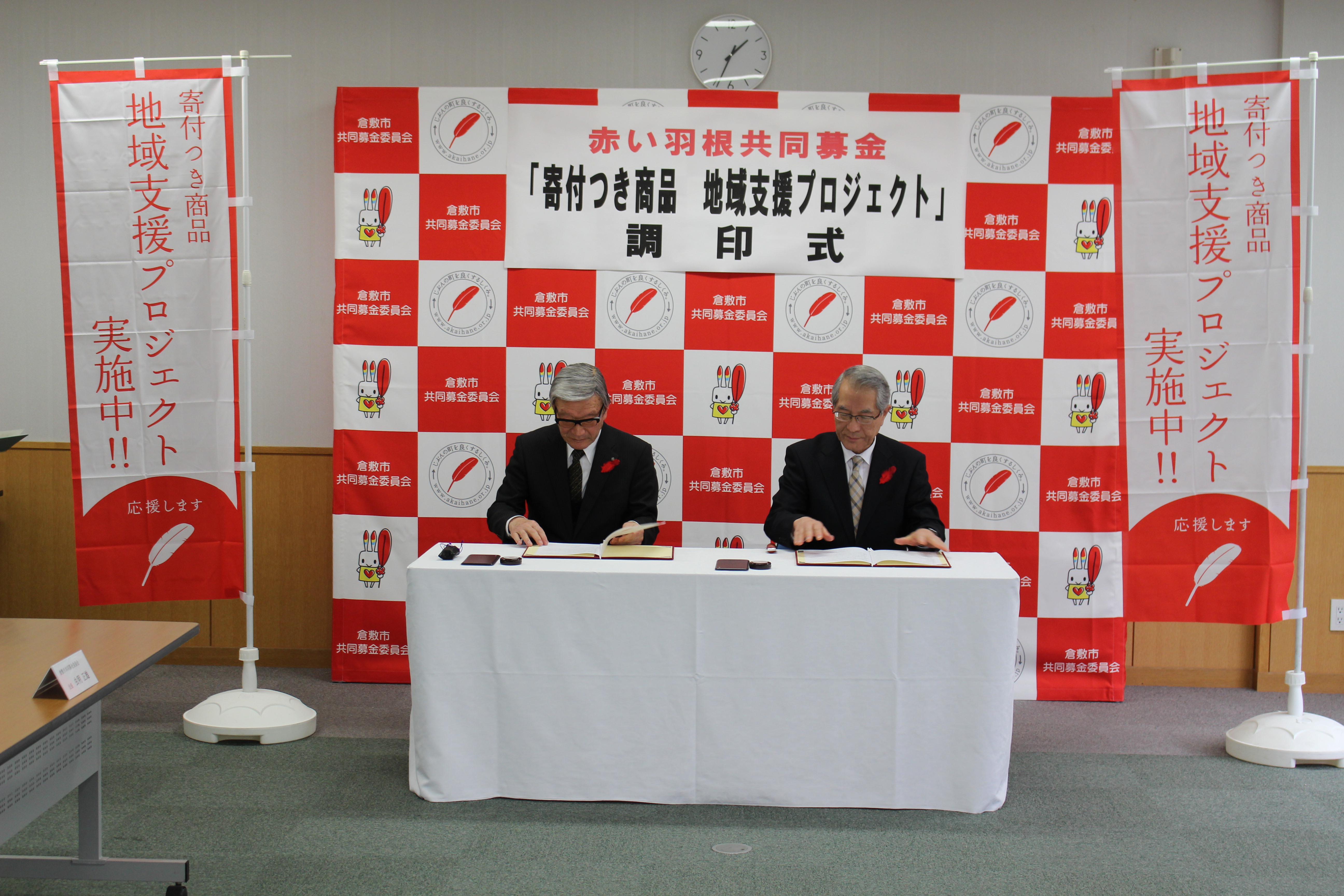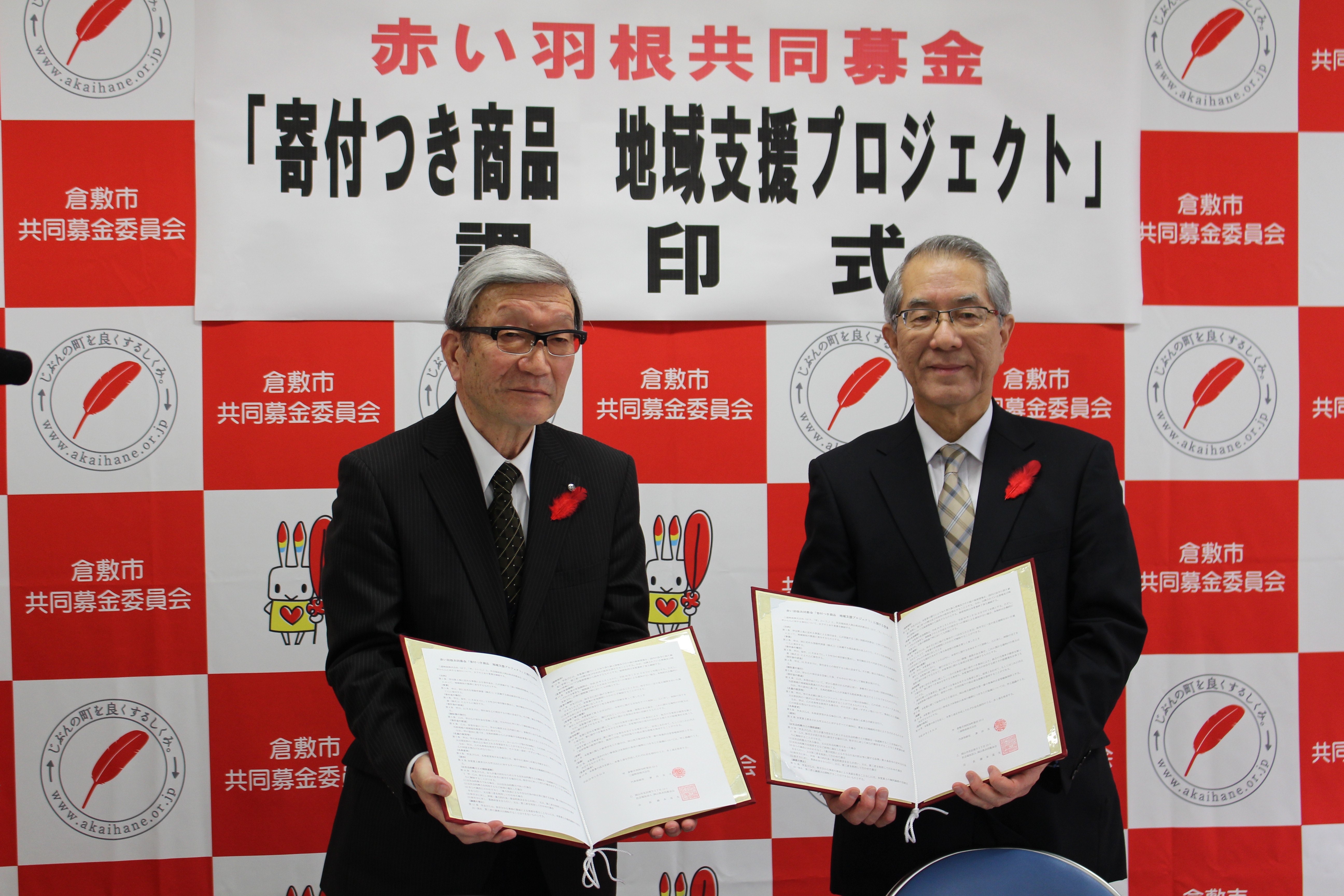本年度から、赤い羽根共同募金「寄付つき商品 地域支援プロジェクト」をスタートしておりますが、このたび、岡山県内で11番目となる三盛物産株式会社様と協議が整い、1月31日(火)に、三盛物産株式会社専務取締役 難波秀男様にご出席をいただき、調印式を行いました。